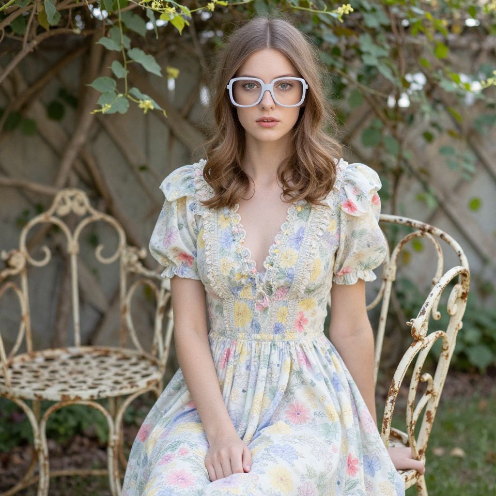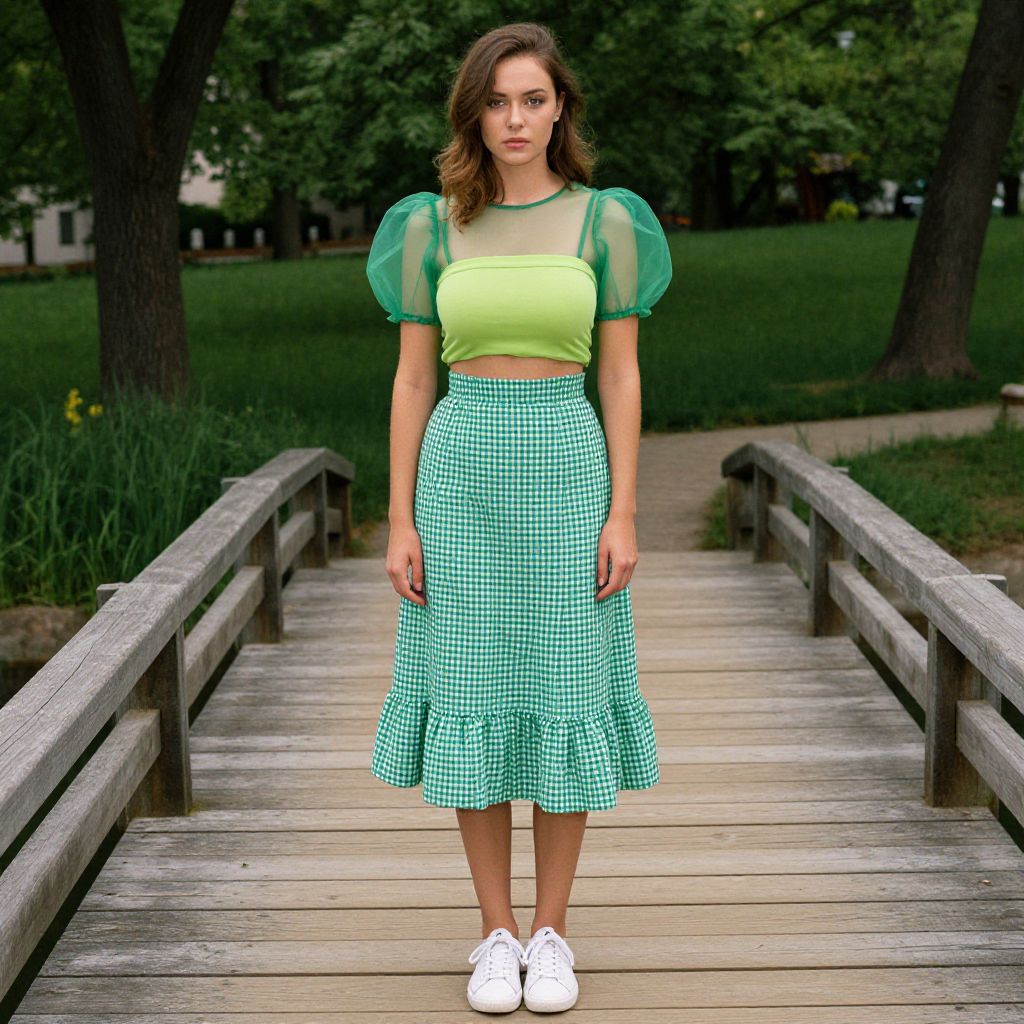 A Slim woman, in a kodachrome analog film style, wearing a sheer green organza top with short puff sleeves over a fitted lime green tube top, paired with a high-waisted gingham midi skirt in green and white with a ruffle hem, and casual white lace-up sneakers, standing at a scenic park with wooden bridges. Sexy. Pretty face and beаutiful eyes. Big breasts