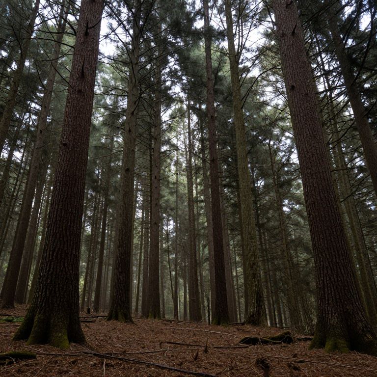 Photograph of a dense, tall pine forest with towering, straight trees. The trunks are dark brown and textured with vertical grooves. Light filters through the dense canopy, creating a mix of bright spots and shadows on the forest floor, which is covered in brown pine needles and scattered rocks. The image has a somber, almost mystical atmosphere, with deep shadows and a moody color palette of dark greens, browns, and grays. The perspective is slightly downward-looking, emphasizing the height and grandeur of the trees.