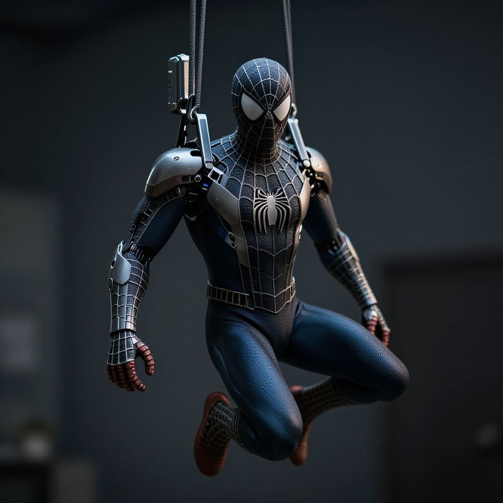"Asian Art spiderman hanging turned into a cybernetic machine. realistic, photorealistic, hyper-realistic, Cinematic lighting, shallow depth of field, ominous and tense.,"