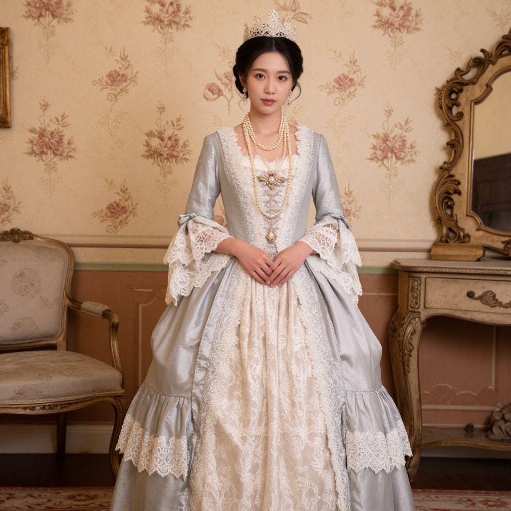 Elegantly dressed woman wearing a Victorian-inspired gown with intricate lace detailing, a pearl necklace, and a crown, standing in a vintage room adorned with floral wallpaper and antique furniture.