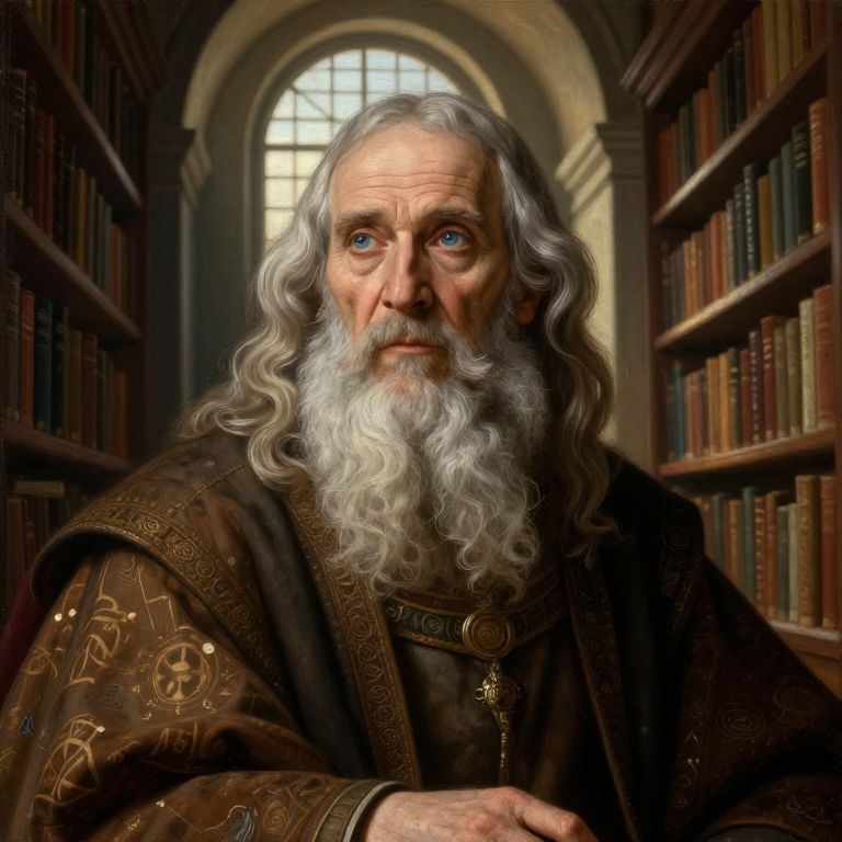 Imagine a Renaissance-style oil painting portrait of an elderly sage with docile blue eyes, a long white beard, and wavy silver hair. The subject sits contemplatively amidst an ancient library's towering bookshelves that reach towards a distant arched window, bathing the scene in warm ethereal light. From a low angle perspective, we gaze up at the sage's face, noting the subtle creases and lines etched by years of wisdom. The interplay of soft sunlight illuminating his features contrasts with the rich textures of his aged skin and intricate robes adorned with mystical symbols, evoking deep reverence for accumulated knowledge.