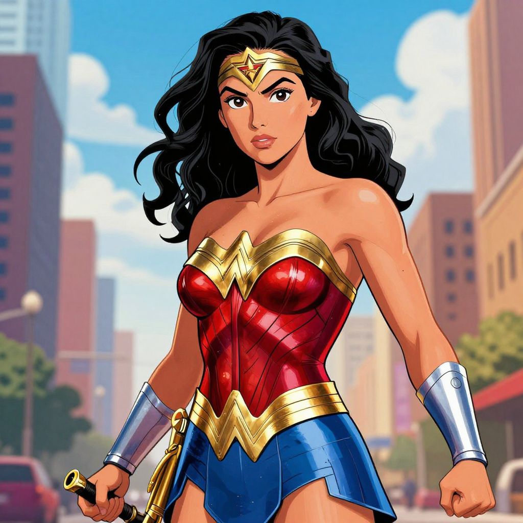 A vibrant digital illustration of Wonder Woman, rendered in a bold, comic-style aesthetic with vivid colors and dynamic lighting, captures her iconic red and gold costume against a sunny urban backdrop, embodying timeless heroism and nostalgia. #wonderwoman #hero ⚡️