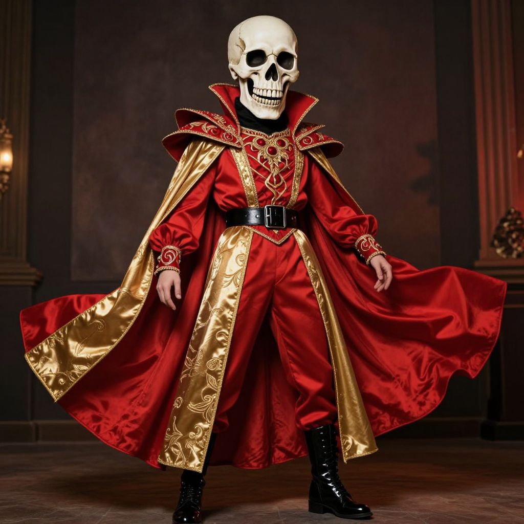 A person in a vibrant and elaborate costume with a large, detailed skull on their head, wearing a red and gold outfit that features flowing fabric, intricate embroidery, and a dramatic cape. The outfit is paired with a sleek black belt and polished black boots, giving a bold and striking appearance. The person stands confidently in a dimly lit, atmospheric setting, with shadows and soft lighting enhancing the eerie yet stylish aesthetic. The overall vibe is a mix of horror and glamour, blending spooky elements with a rich, theatrical flair.