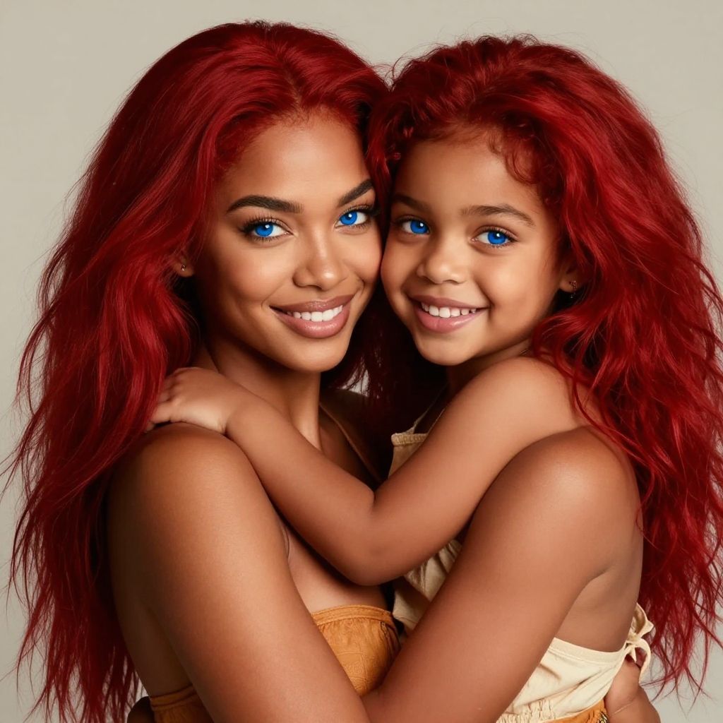 Masterpiece, best quality, ultra realistic, 8k uhd, very high quality, extremely detailed face:, dark skin and very muscular Egyptian-Japanese mother holding her dark skin female toddler, both are smiling and happy, both have bright blue eyes and absurdly long ruby red hair