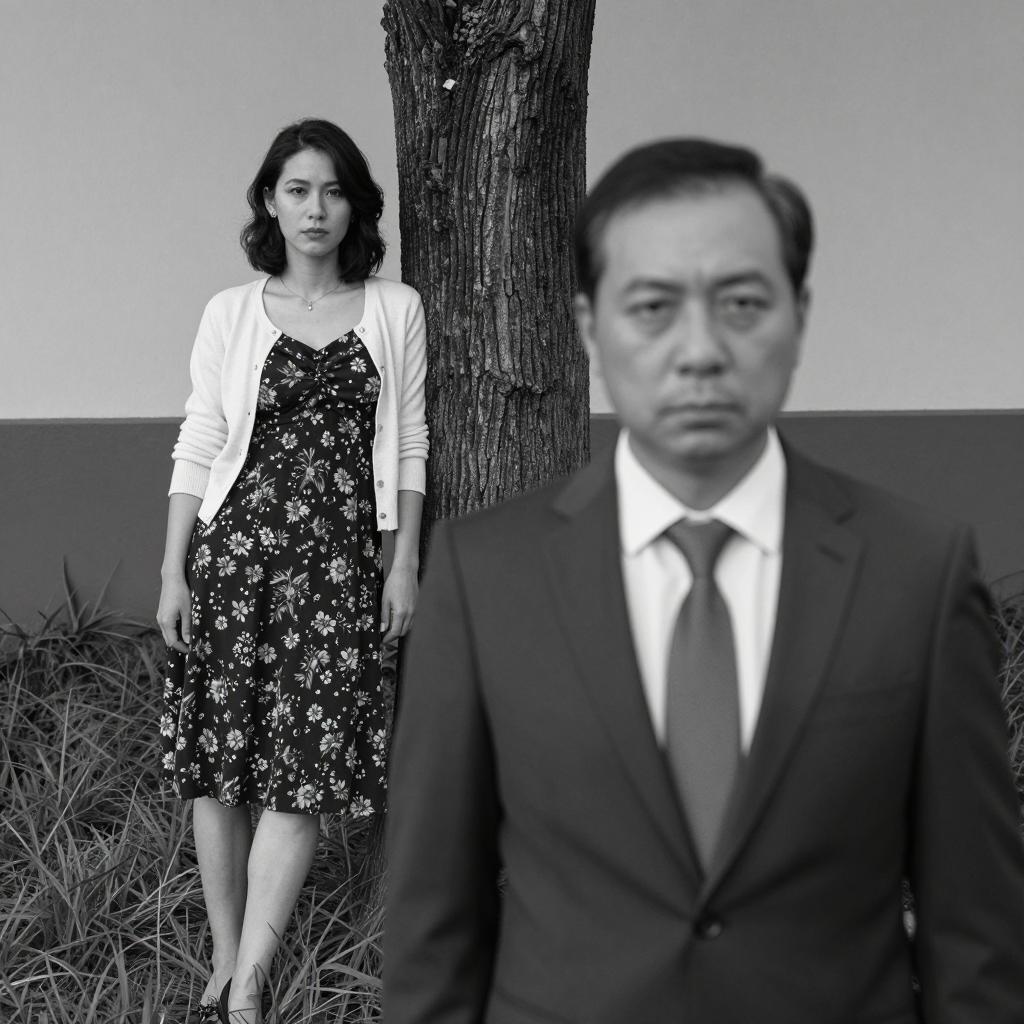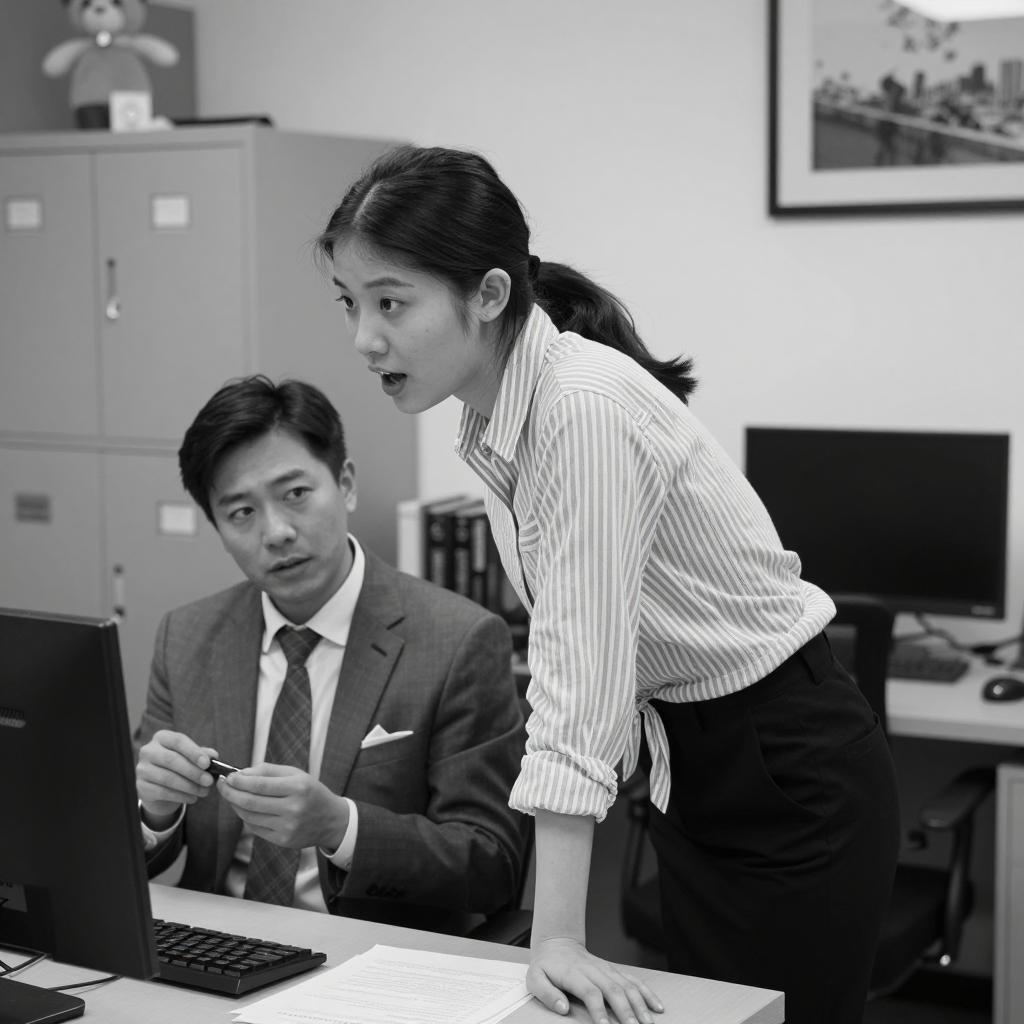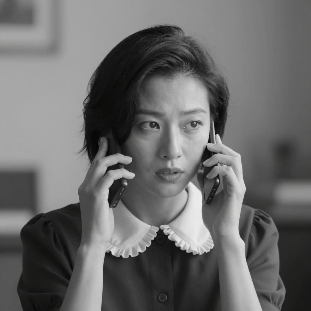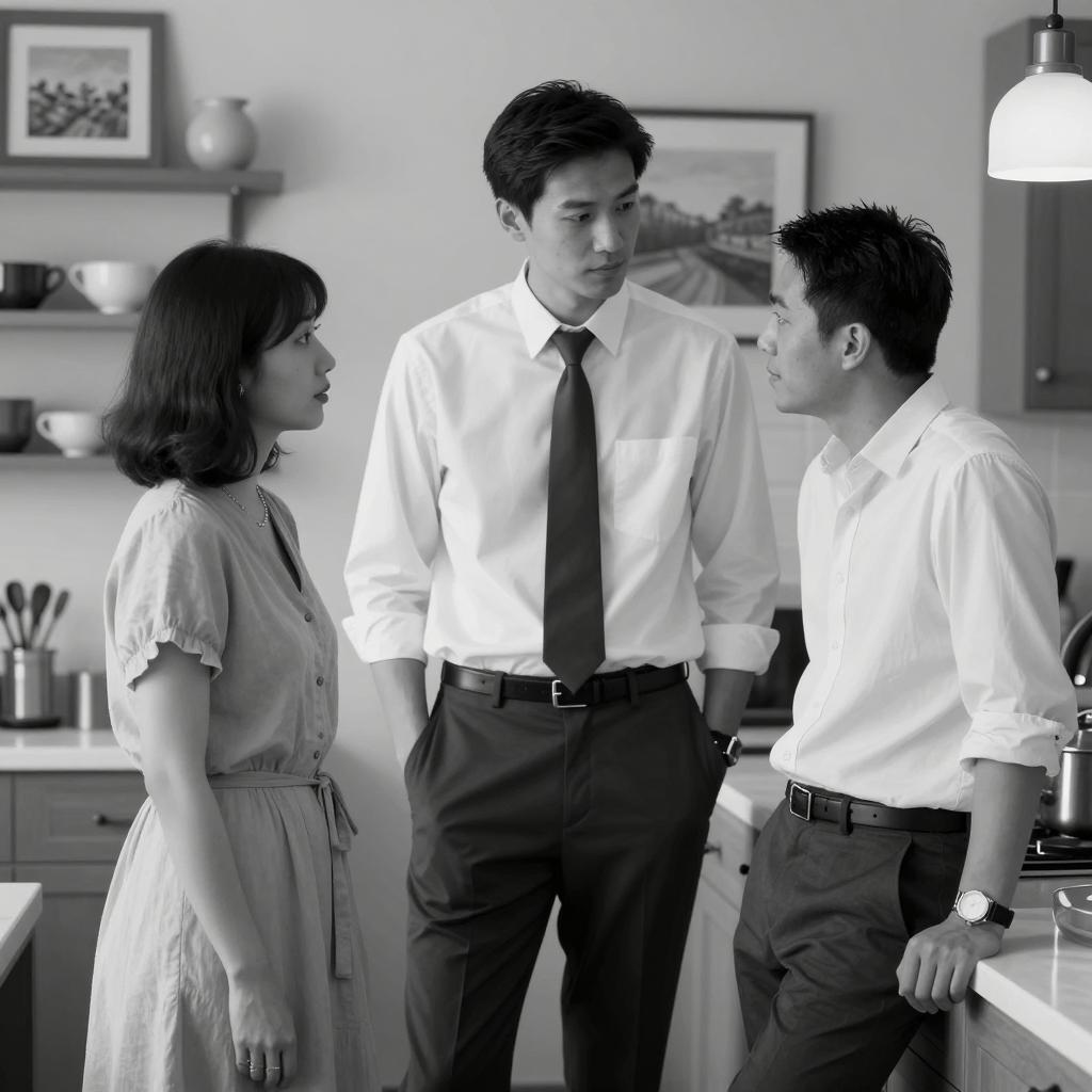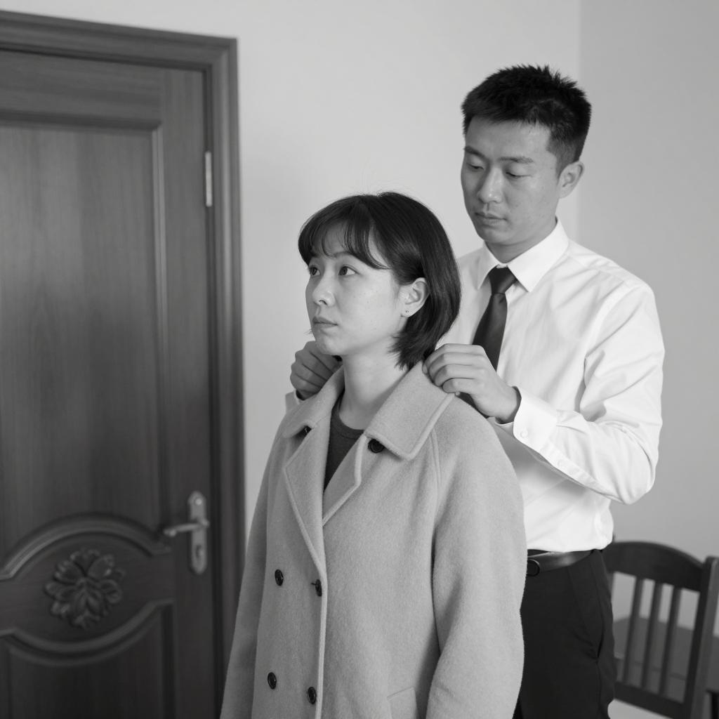 Black and white photograph. Man in white shirt and dark tie stands behind woman with short dark hair, adjusting her collar. Woman wears light-colored coat, looks upward. Wooden door with carved design on left, plain wall in background. Man's expression is focused, woman's expression is neutral. Two people. Wooden chair on right.