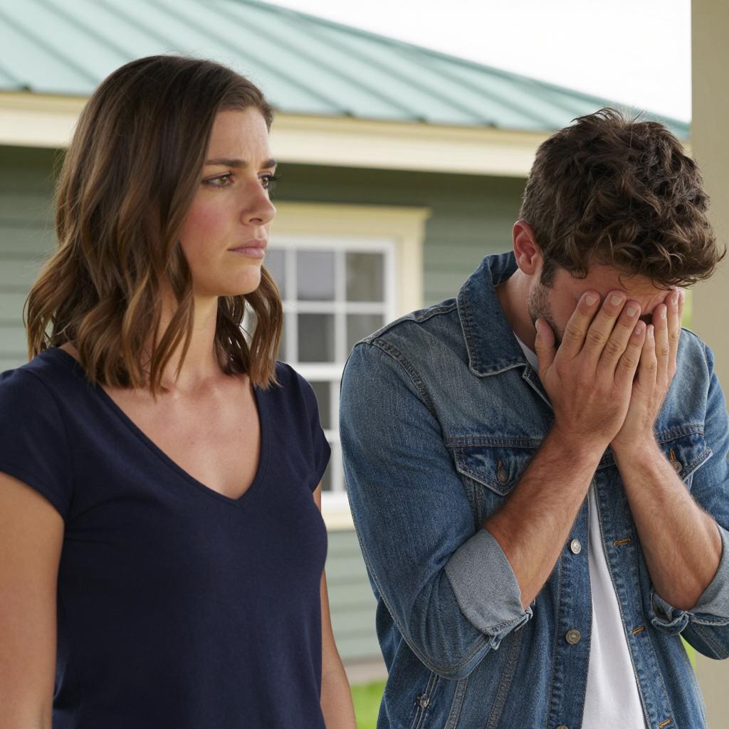 Two women in a cozy living room with dark wooden walls. A woman with long brown hair wearing a floral dress and green cardigan stands holding a sheet of paper, speaking with concern. Another woman with long blonde hair lies on a beige couch, her head in her hands, appearing stressed or upset. The room features a chandelier, air ducts, light curtains, and framed artwork on the walls.