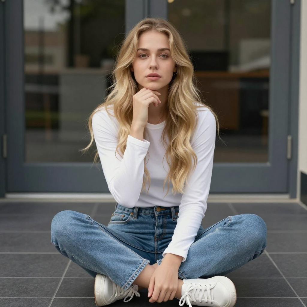 Contemplative Blonde Woman in Casual Outfit