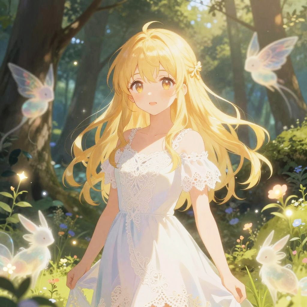 Anime-style digital illustration of a pink-haired girl with large blue eyes, wearing a white dress, surrounded by glowing butterflies in a sunny, colorful garden.