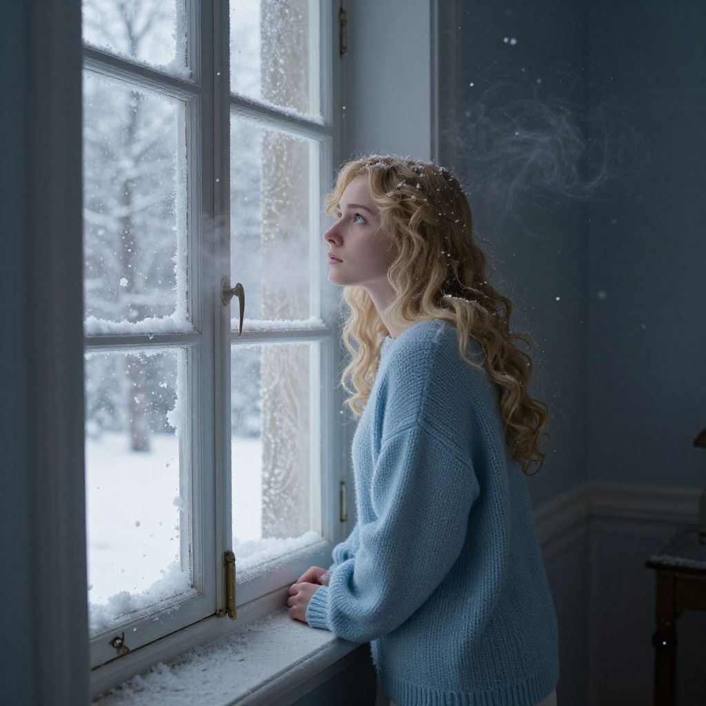Renaissance style in the heart of a frosty winter, a 24 year old adult woman with cascading golden hair stands by an open window, her eyes gazing out at the world beyond. her light blue sweater, knitted with a gentle texture, matches the cool hue of the wall behind her. the room is enveloped in stillness, but it's as if she's in the midst of a storm. snowflakes, like dancers in a winter ballet, flutter outside, swirling and twirling in the cold wind. some of them find their way through the cracks in the window frame, playing hide and seek before settling gently on the sill or melting away on her sweater. she breathes deeply, taking in the crisp air that carries the scent of snow and ice. each exhale releases wisps of steam into the frigid atmosphere, adding to the ethereal ambiance. the sound of snow crunching underfoot can be heard faintly from outside, signaling the arrival of more winter dancers. her face is a canvas of emotion a mix of contemplation, curiosity, and anticipation. it's as if she's waiting for something significant, perhaps an important message or a visitor braving the snowstorm to reach her. the scene is a blend of tranquility and turmoil, a snapshot of a moment frozen in time yet alive with the relentless energy of nature. . realistic, perspective, light and shadow, religious or mythological themes, highly detailed