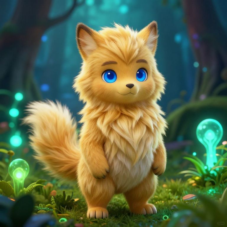 Blonde furry character with golden fur and bright blue eyes, standing in a mystical forest filled with glowing plants, photorealistic style, vibrant colors