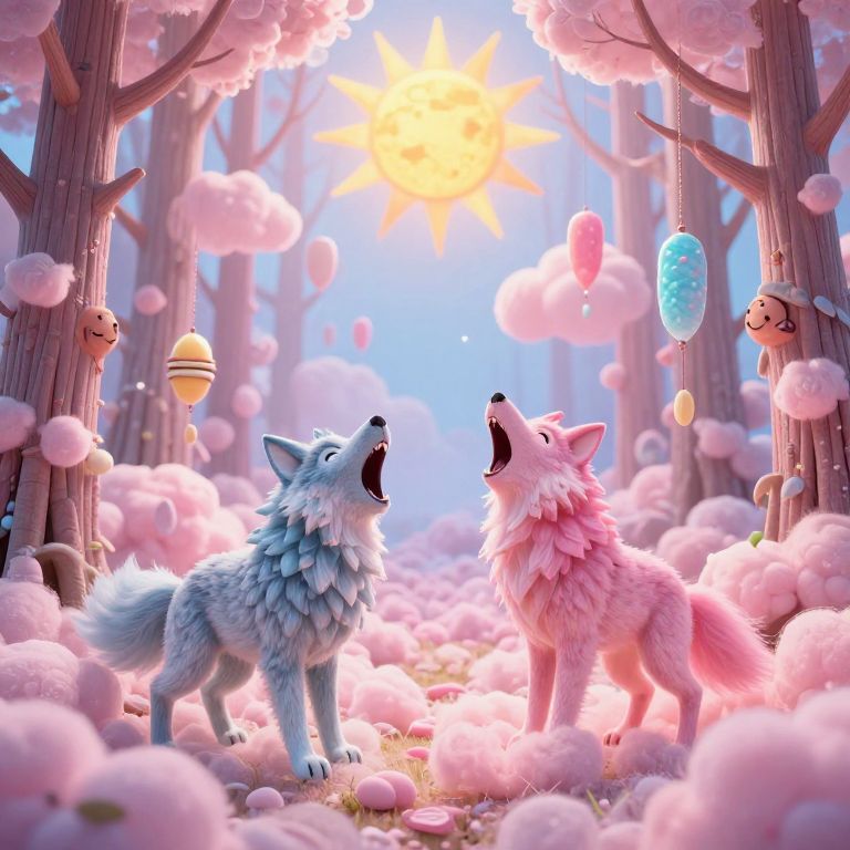 Digital art of two fluffy, animated wolves standing in a magical forest. The wolf on the left has blue-gray fur, while the one on the right has pinkish fur. Both have their mouths open, seemingly howling. Surrounding them are fluffy pink clouds, colorful balloons, and trees with smiling faces. A bright, glowing sun is in the background, casting a warm, magical light. The wolves are centered in the image, surrounded by whimsical, pastel-colored elements, creating a dreamy, enchanting atmosphere.