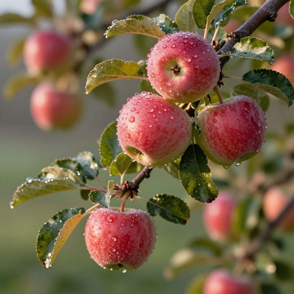 Extremely Realistic, more detail XL, photo r3al, Small red ripe apples on an apple tree covered in morning dew, Apple tops always hang on apple trees.The dew reflects the dazzling morning sunlight and looks very bright.