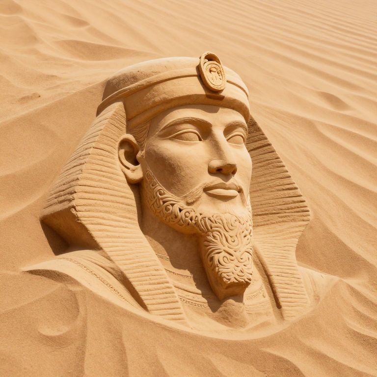 Abstract a small ancient stela, made of rough stone, a bearded god is depicted in the stone, punic script, partially buried, ruined ancient temple environment, arid, dry, digital painting,