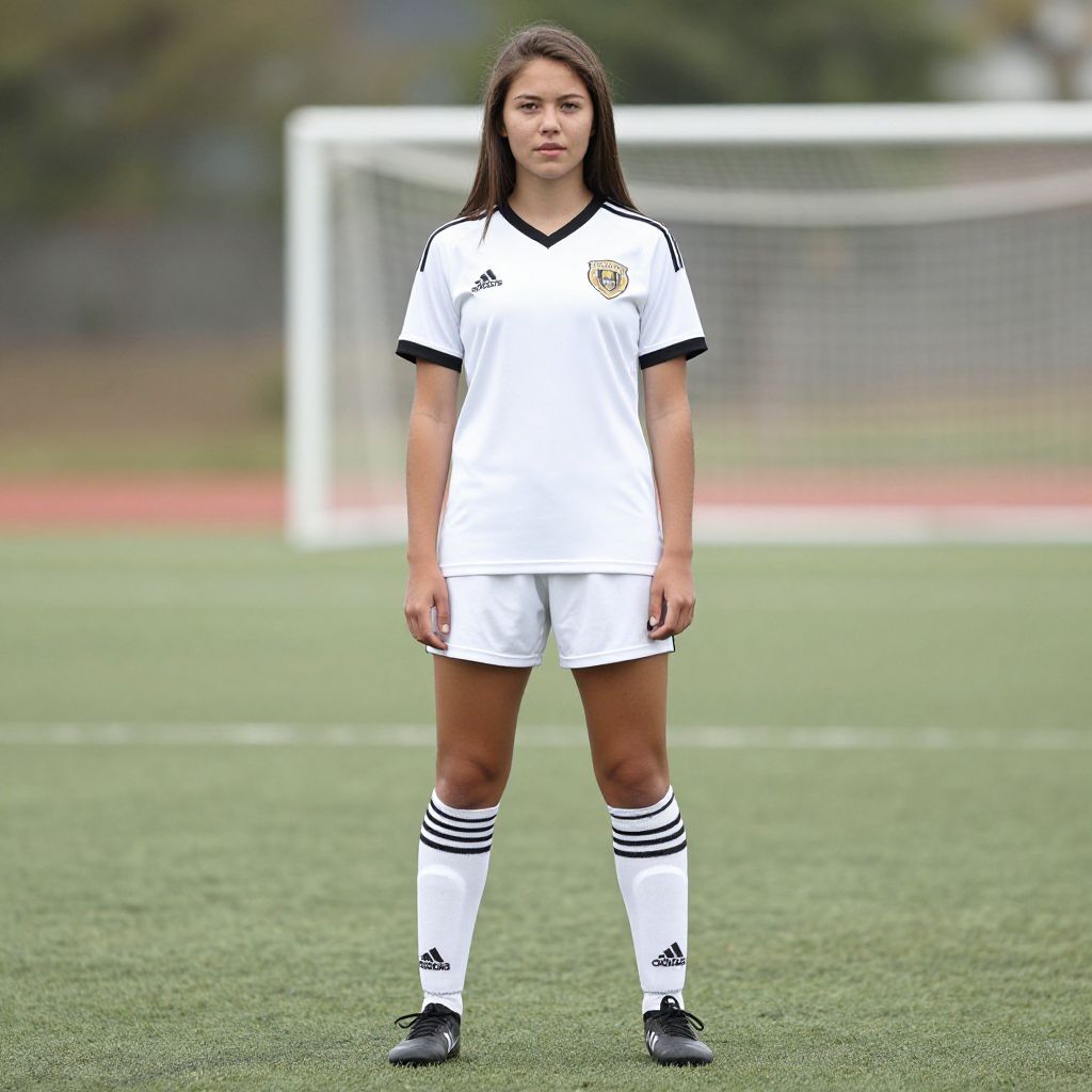 Photograph of a young woman standing on a soccer field. She has long, straight brown hair and a light skin tone. She is wearing a white soccer uniform with black trim, featuring a short-sleeved jersey with a small crest on the left chest, white shorts, and white knee-high socks with two black stripes. She is also wearing black soccer cleats. The background shows a blurred soccer goal and green grass with a reddish track visible in the distance. Her expression is neutral, and she stands with her feet shoulder-width apart, facing the camera.
