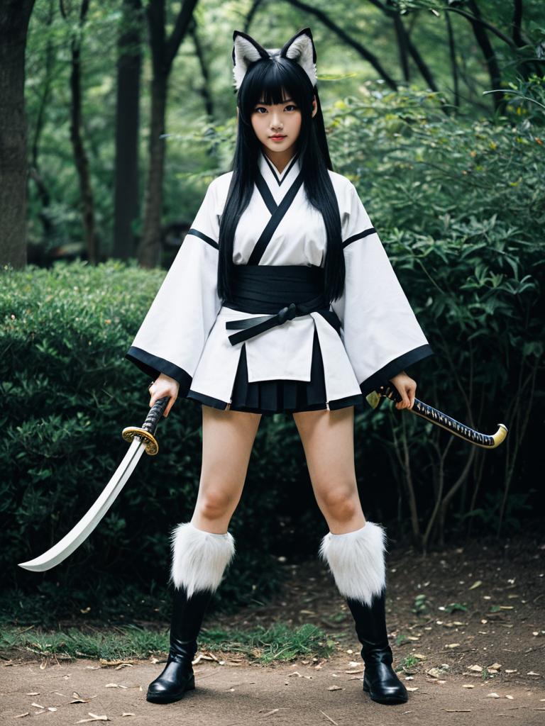 Photo-realistic cosplay photo of person in anabuki tomoko costume. 1girl, fox girl, fox ears, fox tail, black eyes, black hair, long hair, katana. full body shot