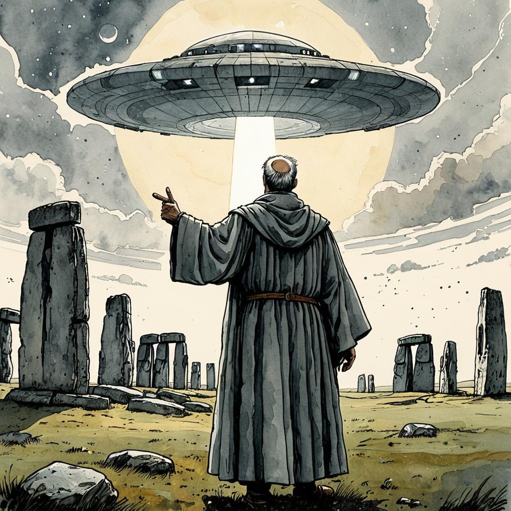 A realistic and atmospheric watercolour fantasy concept art of one dirty medieval monk in grey robes pointing up at a ufo in the sky above stonehenge. muted colors. by rebecca guay, michael kaluta, charles vess and jean moebius giraud