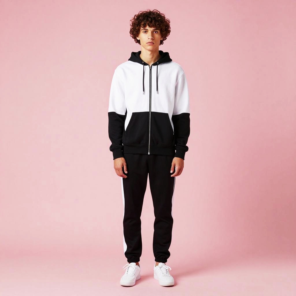 Photograph of a young man standing against a solid pink background. He has curly brown hair and a serious expression. He's wearing a black and white zip-up hoodie with white on the chest and sleeves, black on the sides and bottom, black track pants with a white stripe on the left leg, and white sneakers. His hands are relaxed at his sides. The overall style is casual and modern.