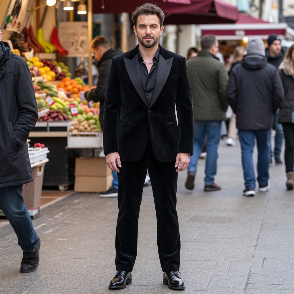 "a man, black velvet suit, modern cut, peak lapel blazer, straight-leg trousers, black silk shirt, polished black derby shoes, vibrant stalls, colorful produce, bustling crowds, camera obscura, confident expression, slight smile. Man has masculine face and piercing eyes"