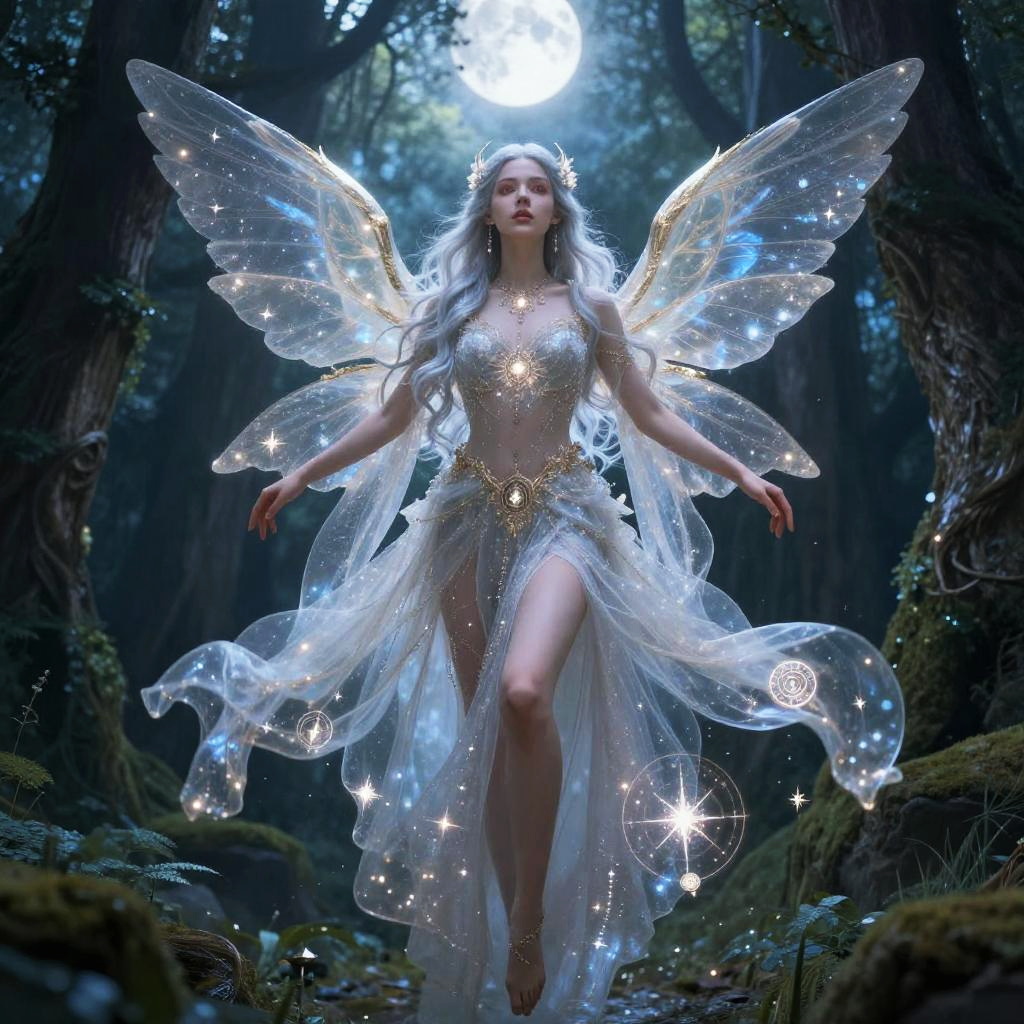 Ranni real form illustrated as a graceful sorceress with translucent wings made of stardust, flowing silver hair, luminous eyes, and an ornate celestial gown decorated with celestial symbols, hovering above an ancient enchanted forest bathed in moonlight.