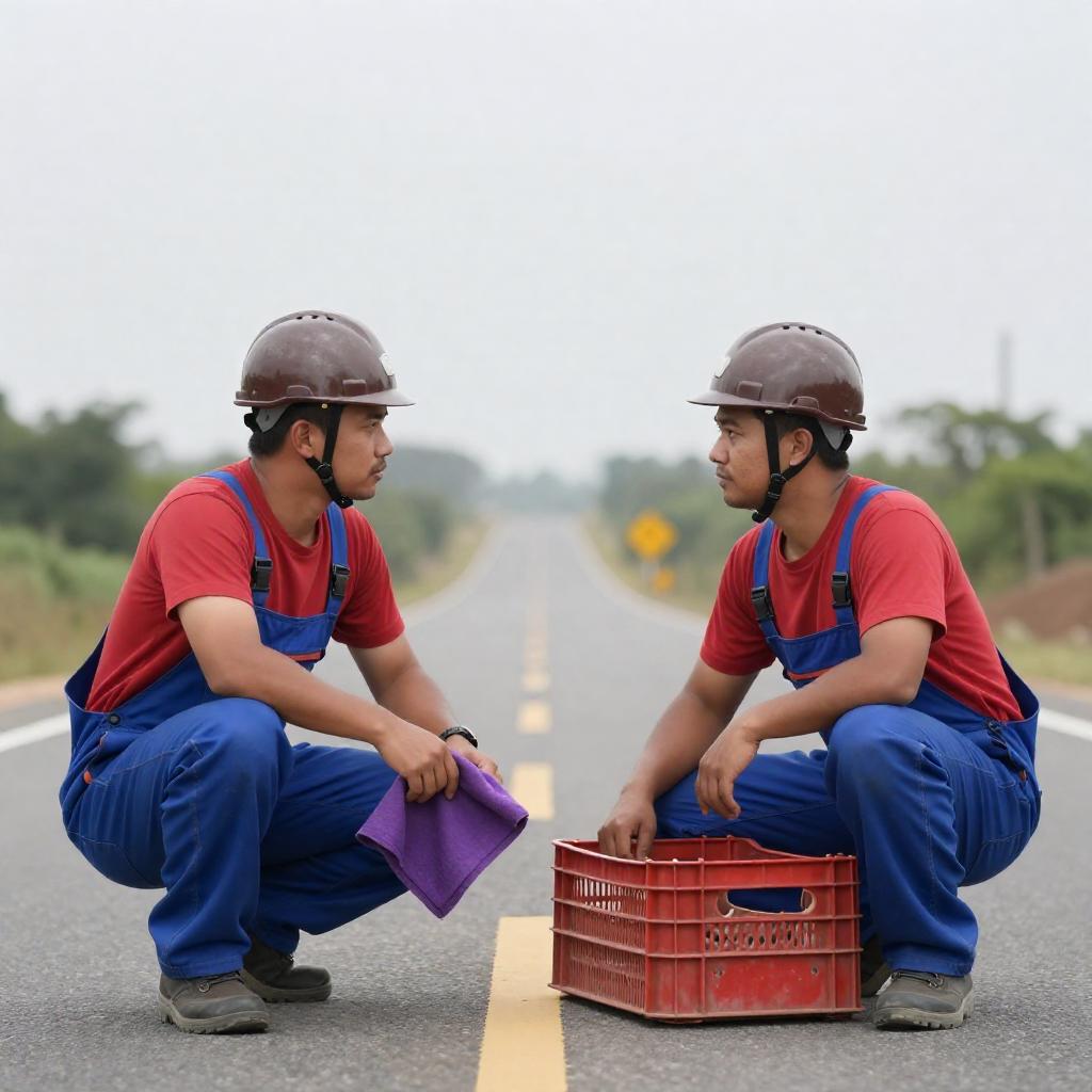 Photograph of two male road workers in brown helmets, blue overalls, and red shirts, crouching on a narrow, yellow-lined road. One holds a purple cloth, the other a red crate. Overcast sky, sparse vegetation, and distant yellow road sign in background. Both looking at each other intently.