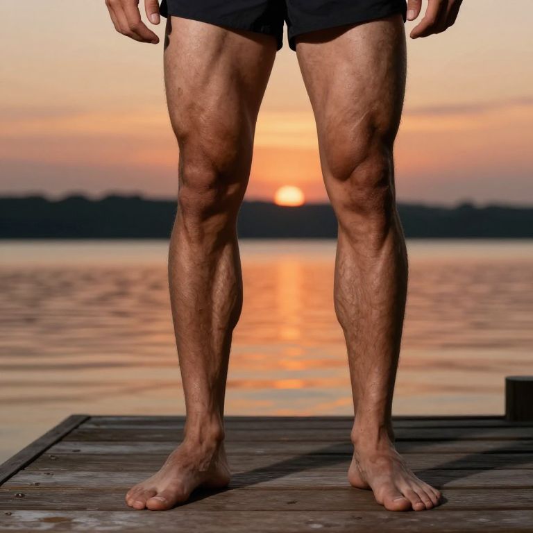 A candid, naturalistic photo of a male athlete with clear, defined features and a focused gaze, standing barefoot on a wooden dock at sunset, emphasizing the detailed musculature and structure of his legs, with water reflecting the orange sky in the background.