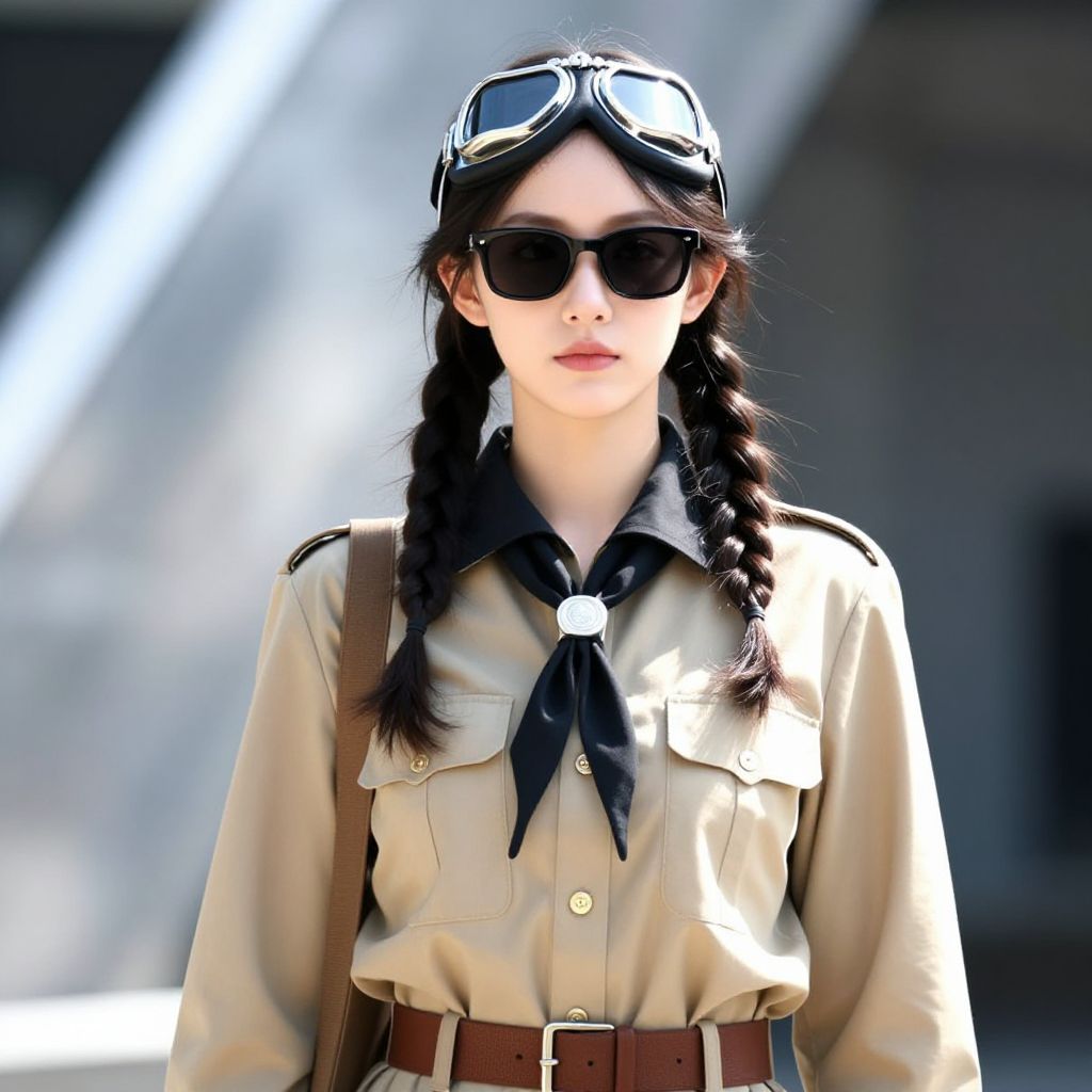 Photograph of a young woman with fair skin and dark brown hair in two braids, wearing black aviator goggles on her head, dark sunglasses, and a beige military-style shirt with black neckerchief and brown suspenders. She has a serious expression and stands in front of a blurred, bright background with diagonal light beams. The image has a slightly over-saturated, digital art style, emphasizing the contrast between her outfit and the background. The lighting highlights her face and upper body.