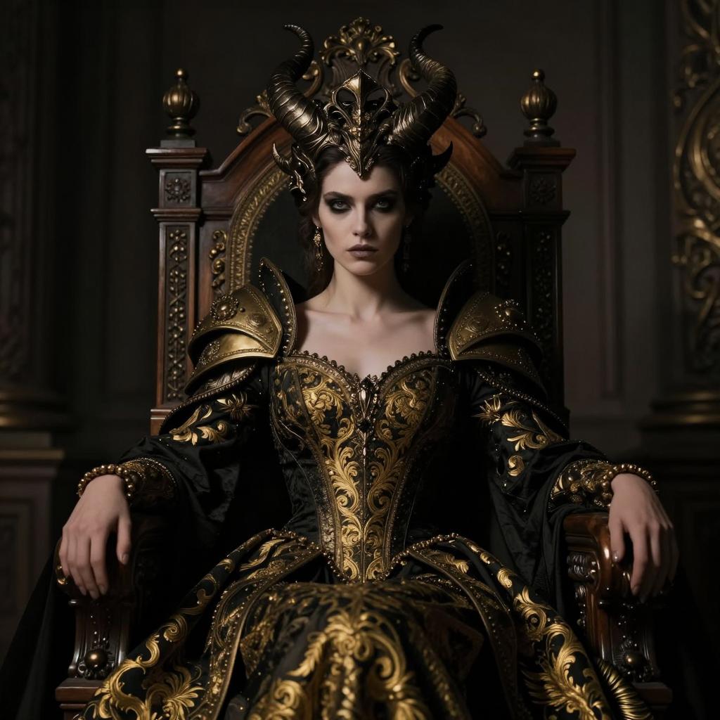Dark prince outfit, digital artwork, queen character, regal, black leather dress with gold trim, tight corset, long sleeves, golden crown, serious expression, dark brown hair, standing, ornate background, arches, stone walls, medieval style, detailed ures, realistic lighting, fantasy theme, symmetrical composition, elegant, powerful, commanding presence