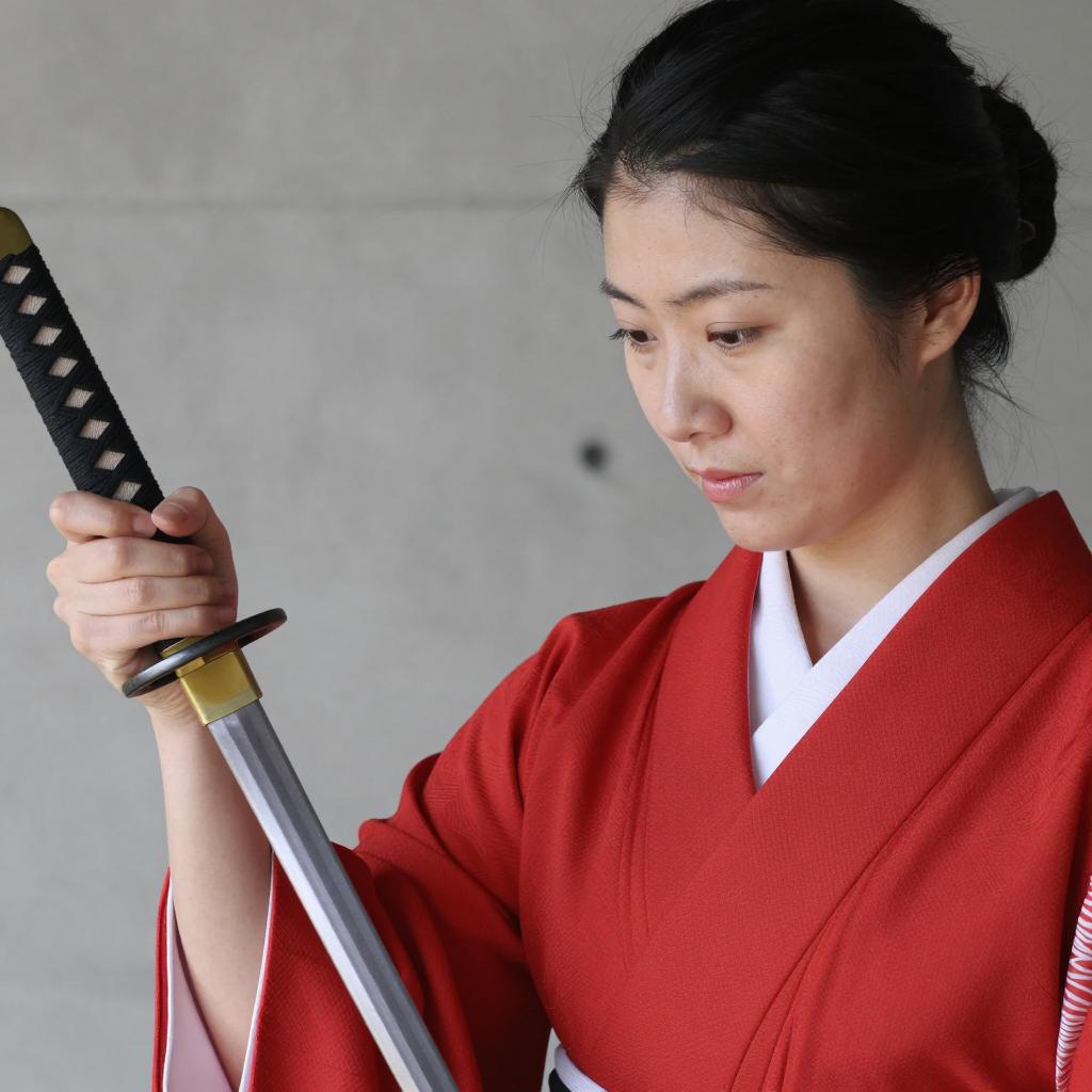 Close-up of a Japanese woman with black hair styled in a bun, wearing a red and white traditional kimono. She holds a katana with a black diamond-patterned handle in her right hand and looks down at the sword with a focused expression. The background features a blurred concrete wall.