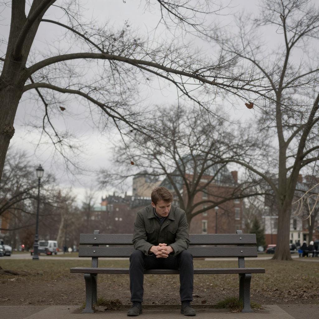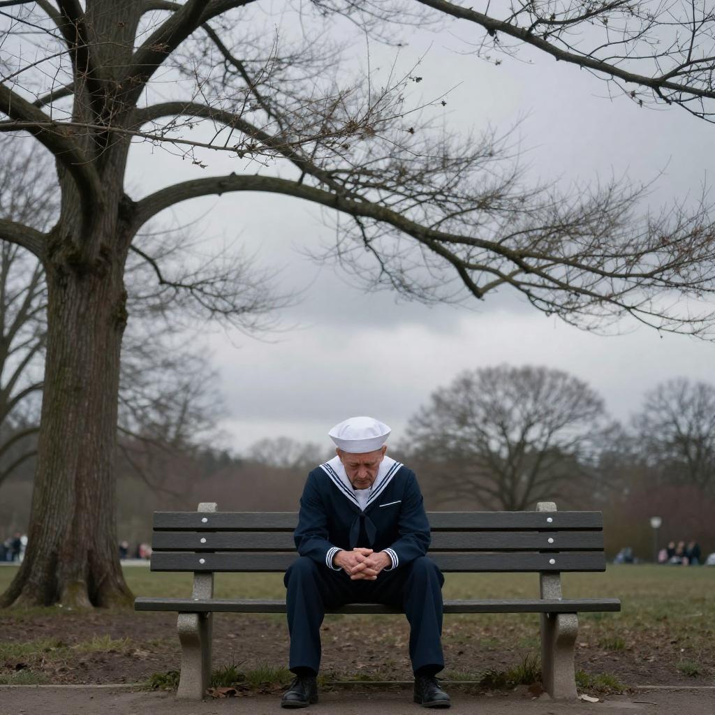 A lone veteran sailor sitting on a park bench, hands clasped together, surrounded by lifeless trees with skeletal branches against a leaden sky, melancholy atmosphere