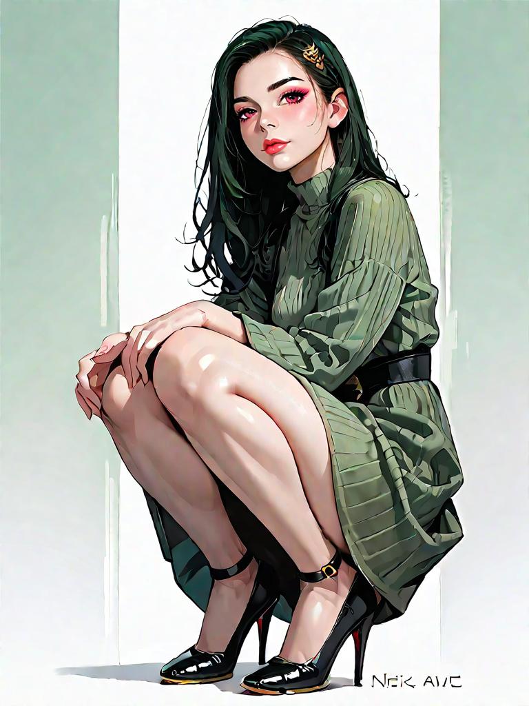 1girl, source_comics, realistic face, full body shot, Woman, chic, olive green knit dress, knee-length, three-quarter sleeves, ribbed texture, scoop neckline with gold accent, tailored fit, black strappy heels.