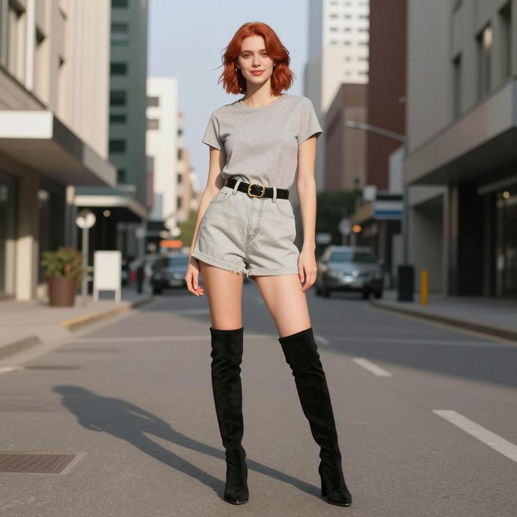 Woman fashion model wearing, photorealistic, woman with short red hair, standing in a city alleyway, wearing gray t-shirt and high-waisted shorts, black belt with gold buckle, thigh-high black boots, confident stance, urban background, tall buildings on both sides, daylight, slight smile, casual yet stylish, modern fashion, street style, urban environment, long shadows, realistic ures