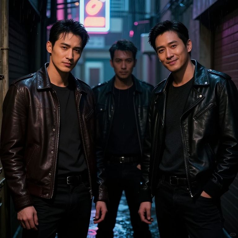 Handsome criminals in a dimly lit urban alley, wearing stylish leather jackets and casual yet polished attire, with mysterious expressions and subtle smirks, surrounded by neon signs and faint rain reflections, cinematic noir atmosphere.