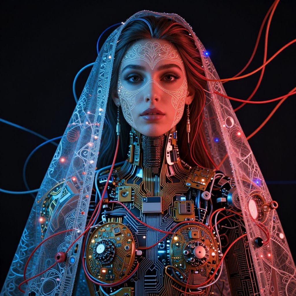 Digital artwork of a cybernetic woman with intricate circuitry patterns, wearing a translucent veil, illuminated by red and blue lights.