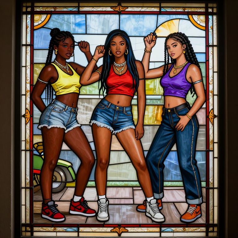 Stained Glass Window 90s hip hop girls in south central dressed in low rise denim, crop tops, braids and sneakers,