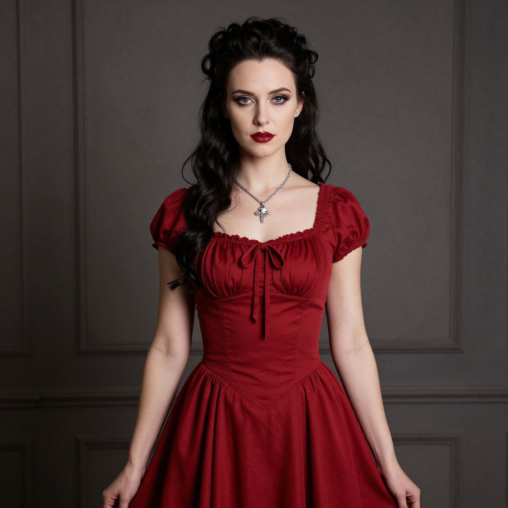 Photograph of a pale-skinned woman with black curly hair, wearing a red, puffed-sleeve dress, cross necklace, and red lipstick