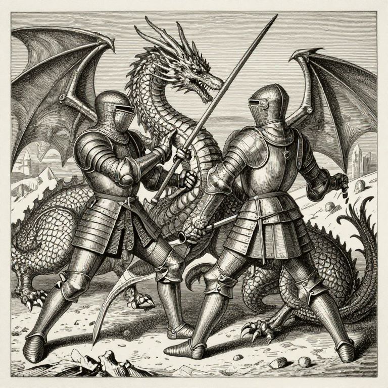 Medieval engraving art showcasing intricate knights in armor battling dragons, detailed shading, classic woodcut style, rich textures, vintage monochrome aesthetic