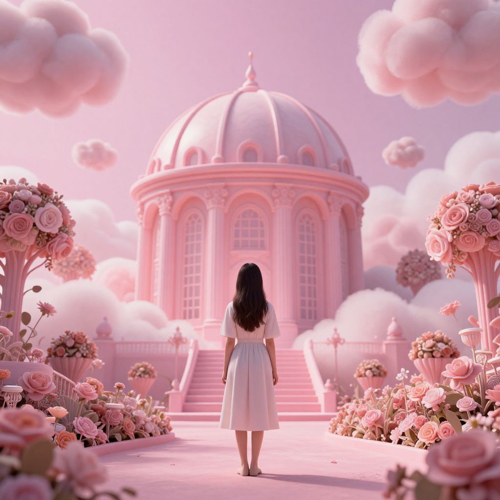A young woman stands in a surreal, pink-lit garden with volumetric lighting, looking at a mysterious, domed building surrounded by floating clouds.