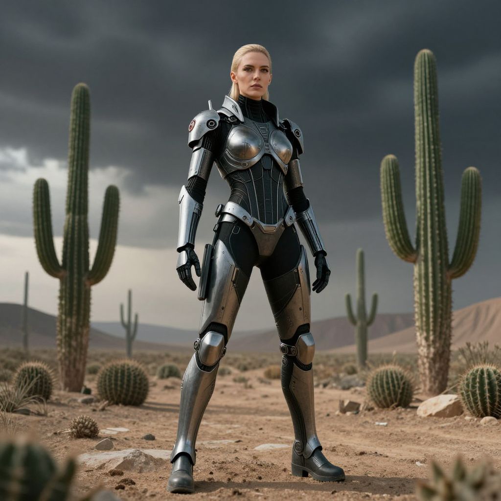 Photorealistic CGI of a blonde woman in futuristic silver armor standing in a desert with cacti, under a dramatic cloudy sky.