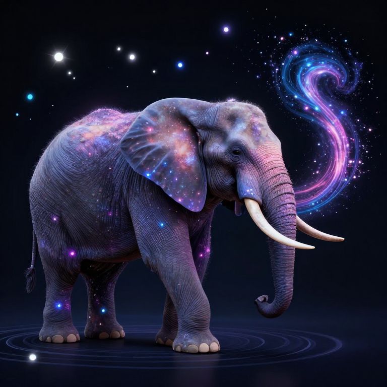 An elephant with a galaxy swirling inside its trunk plays a symphony composed entirely of floating lights and sound waves that manipulate gravity.