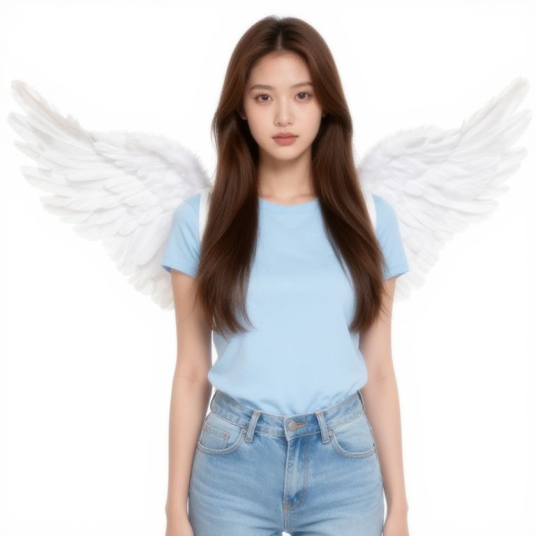 Female with long brown hair, wearing a light blue shirt and light blue jeans with a pair of white angel wings on her shoulders.