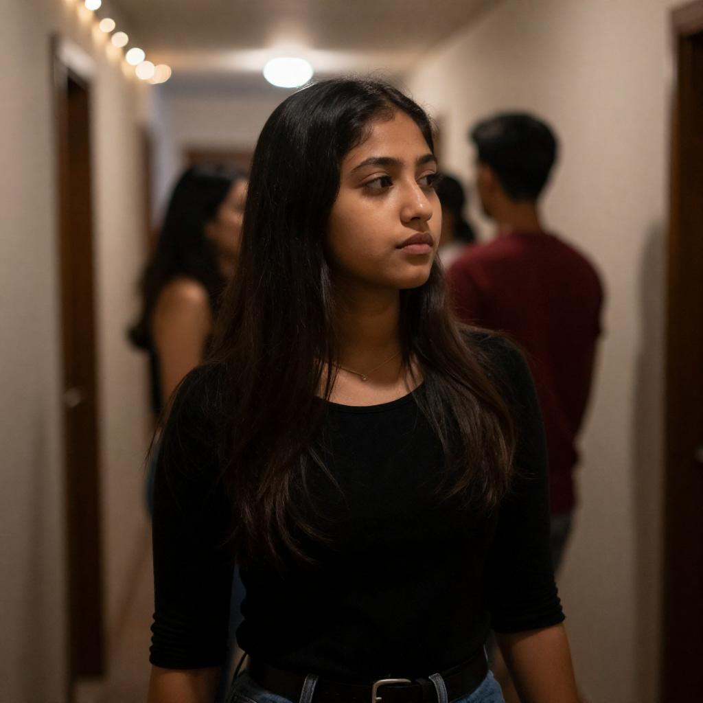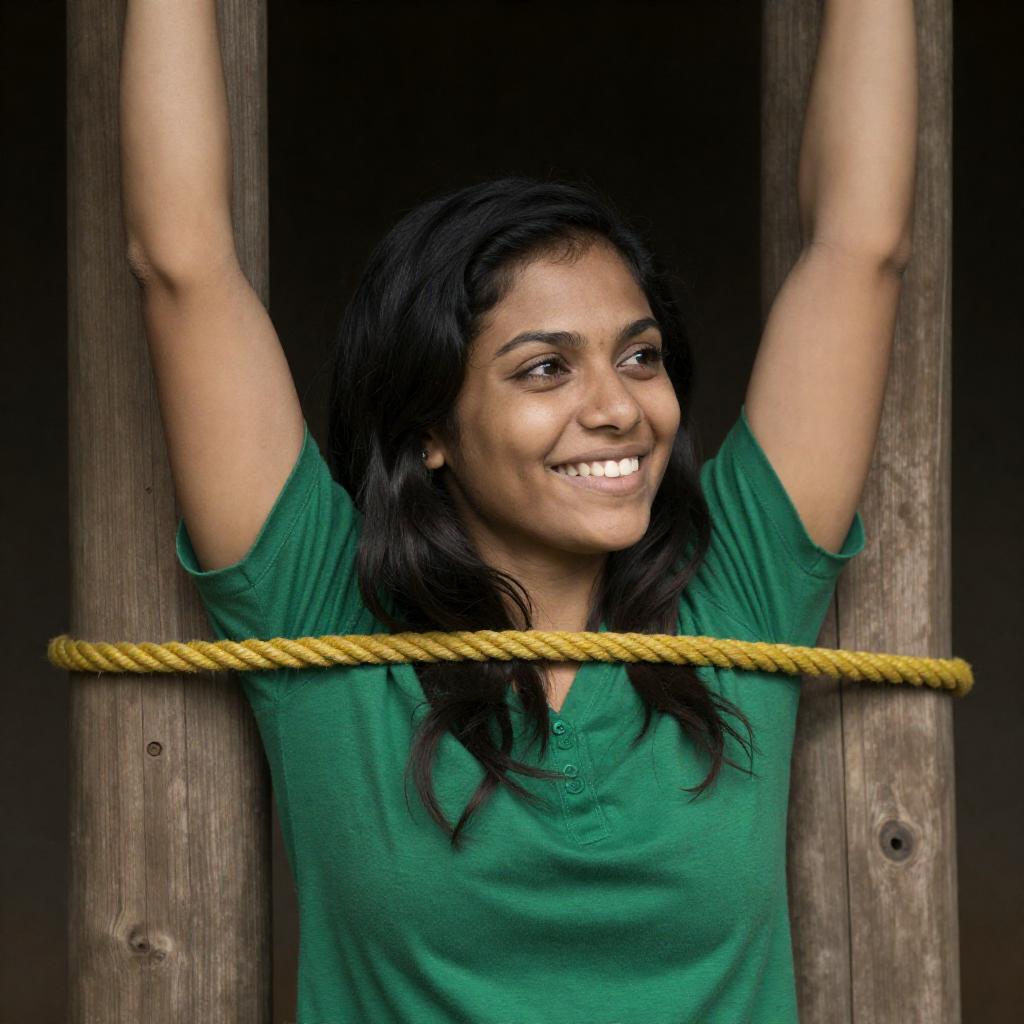 Photograph of a young woman with medium brown skin and long black hair, wearing a blue tank top and dark jeans, standing partially hidden behind tall, gray concrete pillars. Green foliage in the foreground partially obscures her. She gazes to the right with a neutral expression. The background includes more concrete pillars and hints of greenery.
