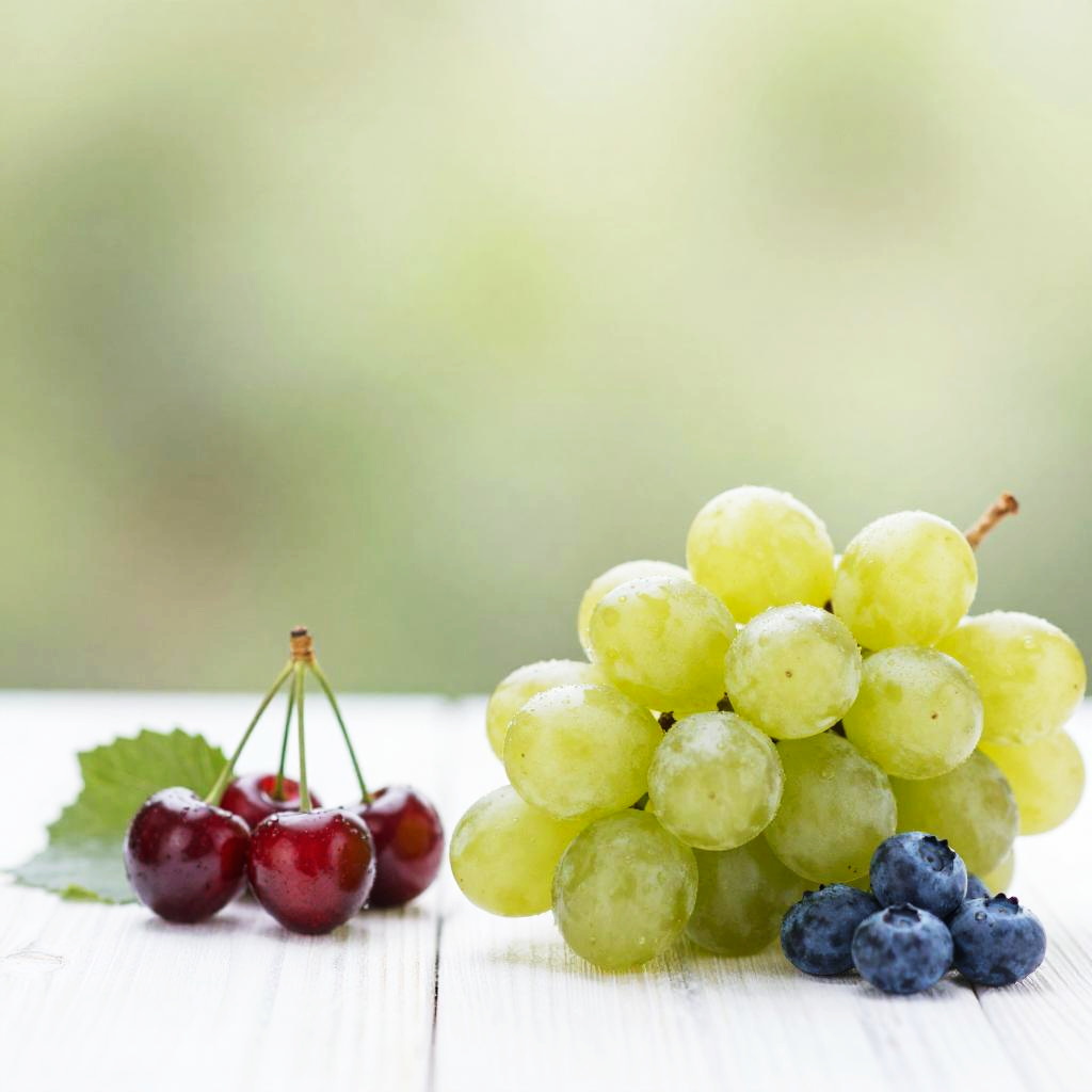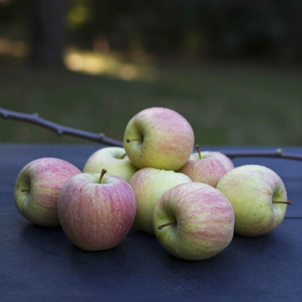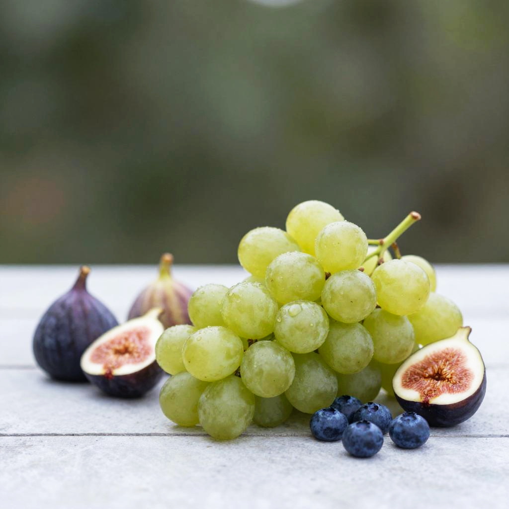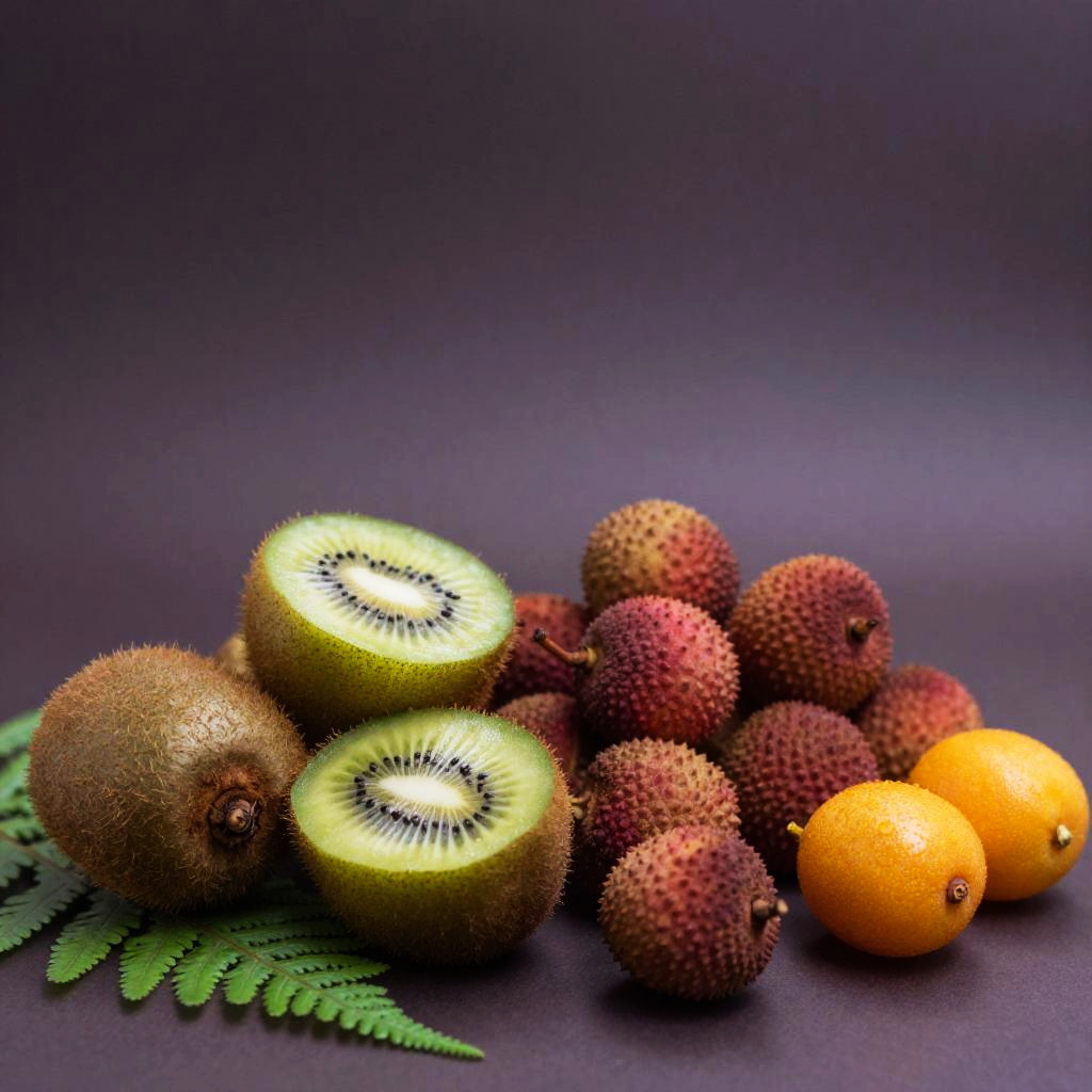 Wide shot, still life, food focus, no humans, outdoors, blurry background, depth of field, bokeh, food, kiwis, passionfruits, starfruits, vine, coral dusk, blurry