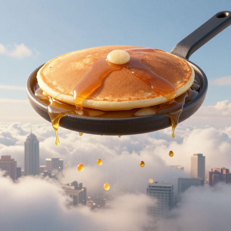 A city bakes beneath a giant griddle hovering in the clouds, where gravity-defying pancakes rain down daily at dawn.
