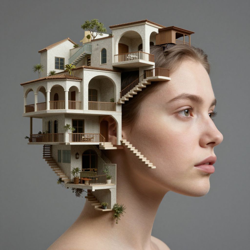 A surreal fusion of human form and architectural wonder, where a woman's head seamlessly integrates with a labyrinthine structure of floating balconies, staircases, and rooms, defying gravity and conventional boundaries.