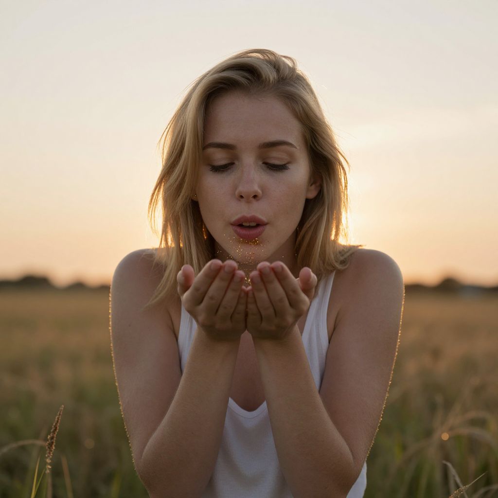 Blonde-haired woman gently blowing golden glitters from her cupped hands against a serene sunset backdrop in a tranquil field.