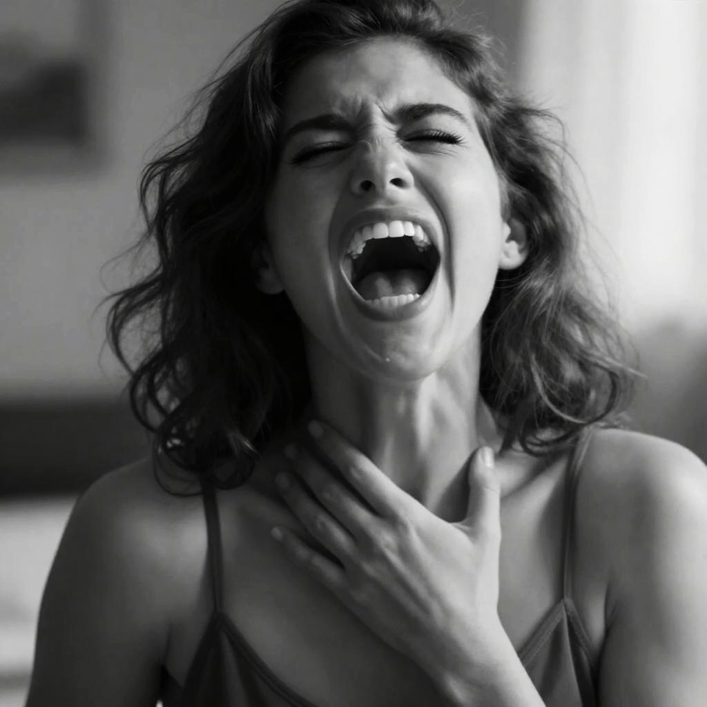 Photograph of a woman with medium-length brown hair, screaming with mouth wide open. She wears a dark green jacket and blue pants, sitting against a dark blue, ured wall. Bright blue lighting highlights her face and upper body.