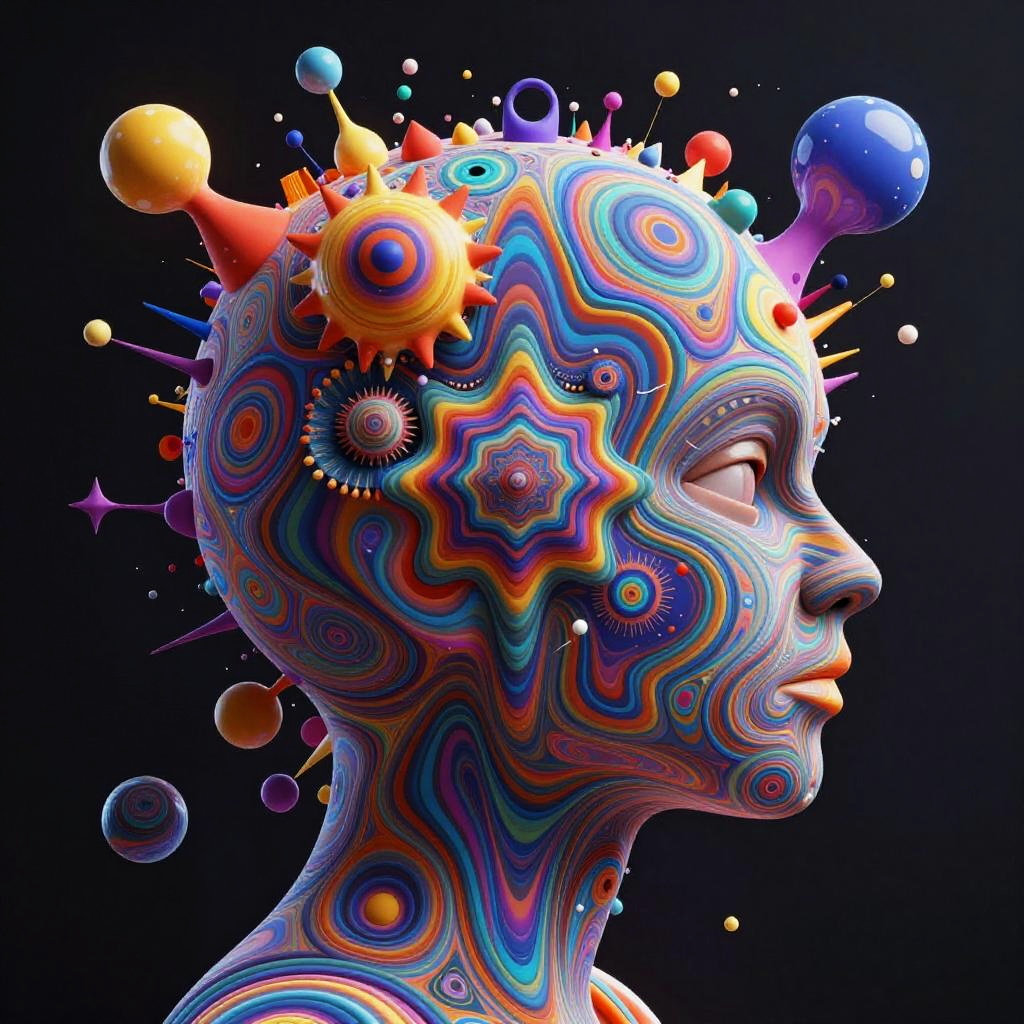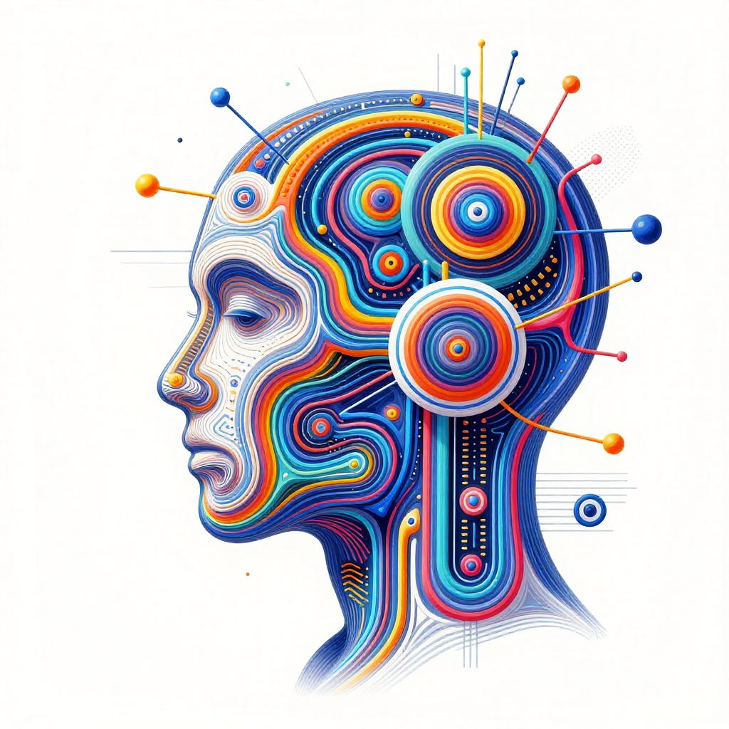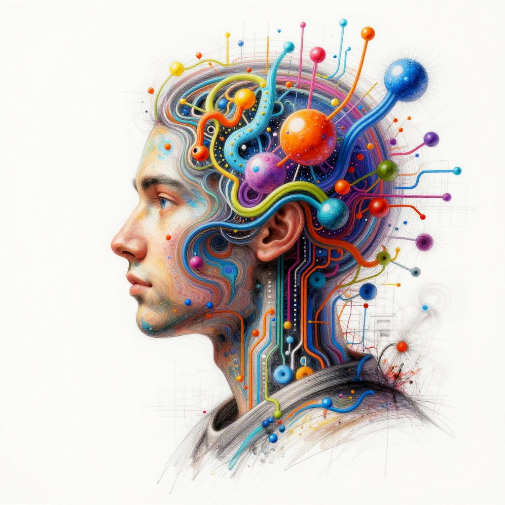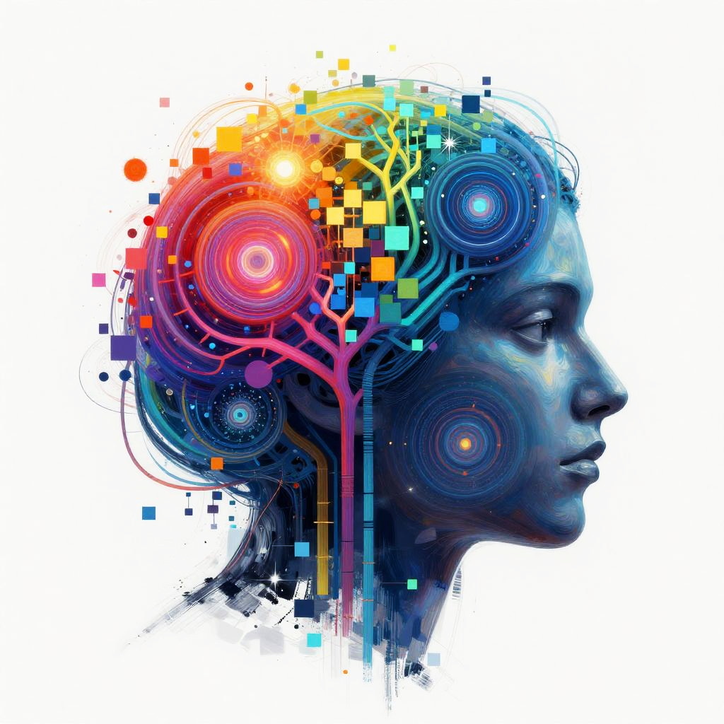 Generative AI drawing showcasing an abstract fusion of human creativity and machine intelligence, swirling colorful data nodes and circuits blending into hand-drawn sketches, dynamic composition with bright colors and complex textures, digital art style.