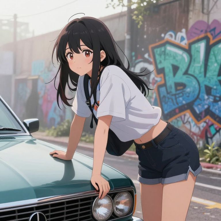 Anime girl leaning over a vintage car hood, wearing casual streetwear, urban graffiti walls in the background, early morning mist, detailed shading and lighting, energetic and youthful vibe