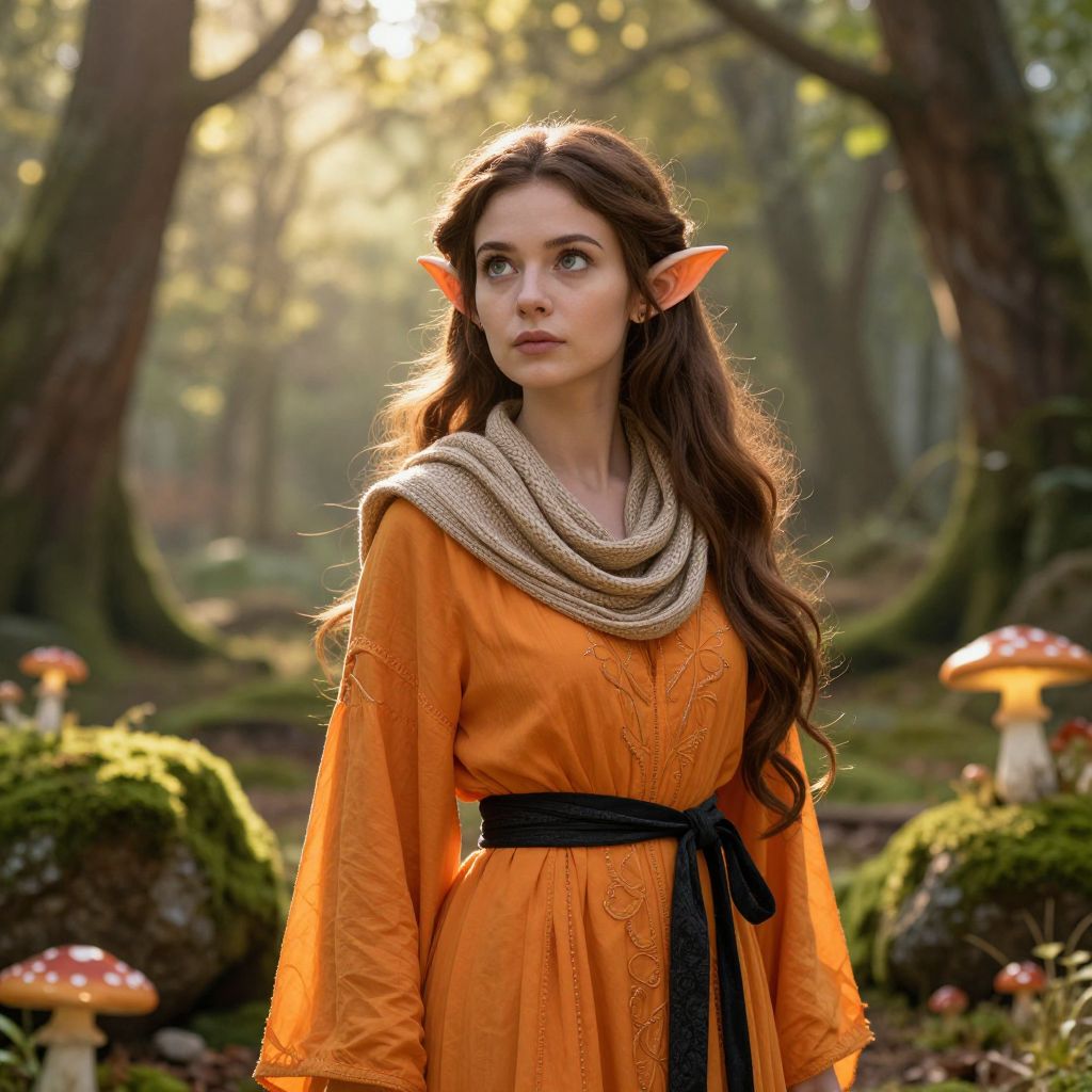 A graceful female elf with long, flowing brown hair that cascades down her back, delicate pointed ears tinged with a warm orange hue, stands in a sun-dappled forest clearing. She wears an elegant orange robe adorned with subtle embroidery, fastened at the waist with a rich black belt, and a soft, woven scarf wrapped around her neck in a flowing, layered pattern. Her eyes are wide and curious, reflecting the golden light of the morning sun. The scene is vibrant and enchanted, with mossy stones, glowing mushrooms, and trees swaying gently in the breeze, creating a serene, mystical atmosphere.