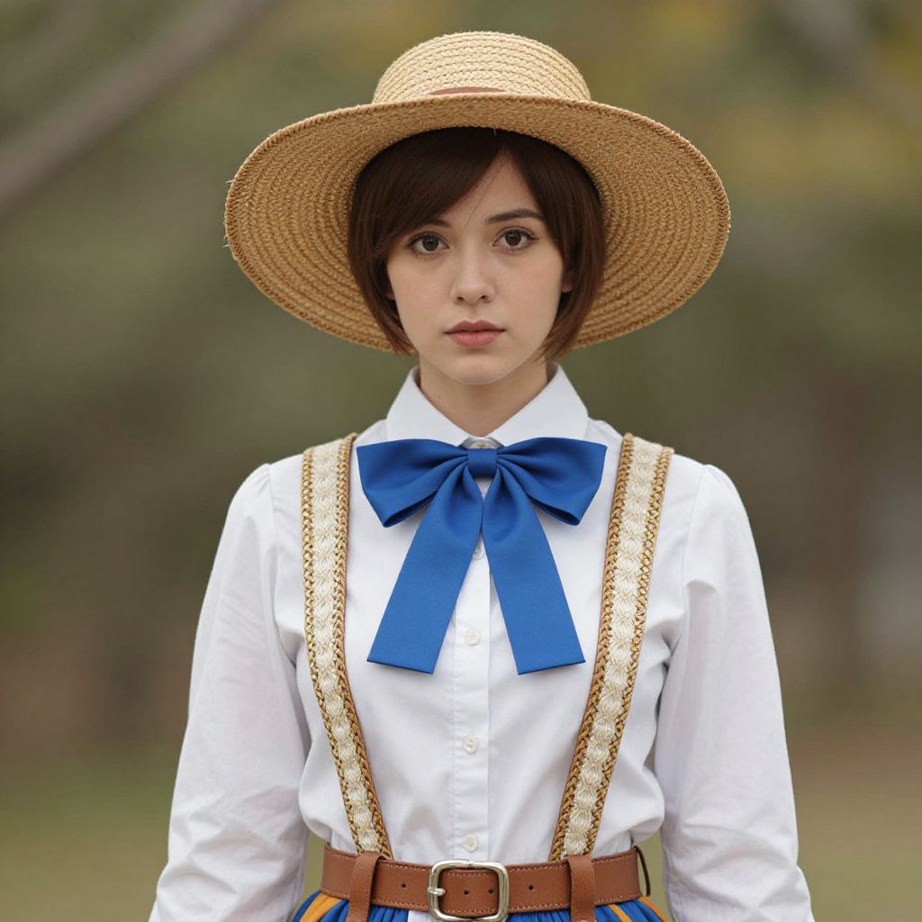 "Woman Woody Costume, woman wearing a hat and a dress with a blue bow"